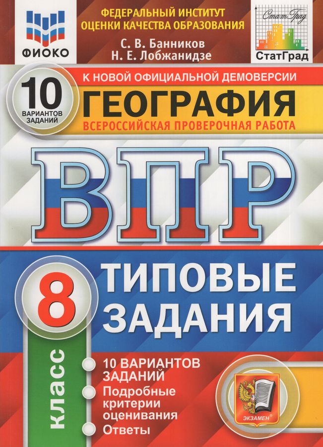 Данное пособие полностью соответствует федеральному государственному образовательному стандарту (второго поколения). Книга содержит 10 вариантов типовых заданий Всероссийской проверочной работы (ВПР) по географии для учащихся 8-х классов. Сборник предназначен учащимся 8-х классов, учителям и методистам, использующим типовые задания для подготовки к Всероссийской проверочной работе по географии. Приказом №699 Министерства образования и науки РФ учебные пособия издательства "Экзамен" допущены к использованию в общеобразовательных организациях.
