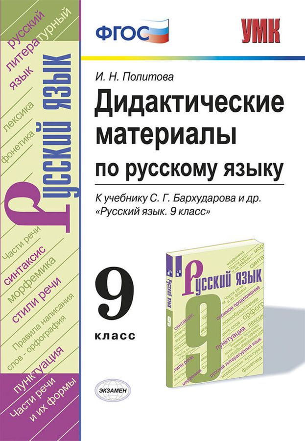 Данное пособие полностью соответствует федеральному государственному образовательному стандарту (второго поколения). Пособие содержит упражнения и задания различной степени сложности и объёма, направленные на закрепление и повторение материала в 9 классе. Пособие составлено на основе методической системы учебника С. Г. Бархударова и др. "Русский язык. 9 класс" и соответствует программе и изучаемому теоретическому материалу. Книга адресована учителям русского языка, но может быть использована учащимися для самостоятельных занятий. Приказом №699 Министерства образования и науки РФ учебные пособия издательства "Экзамен" допущены к использованию в общеобразовательных организациях.