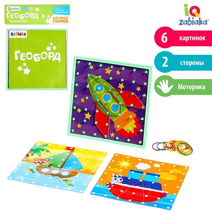 Геоборд — это очень простая и интересная игрушка. Она развивает логику, мышление, мелкую моторику рук. Представляет собой доску со штырьками, к которой прилагаются резиночки и сменные картинки. Резиночки нужно натягивать на штырьки в соответствии со схемами (идут в комплекте). Таким образом будут получаться интересные рисунки и геометрические фигуры. В наборе идет планшет со штырьками (можно использовать самостоятельно), брошюра со схемами, которая сделает игру ещё интереснее. Комплектация Планшет. Картинки, 6 шт. Схемы сборки.